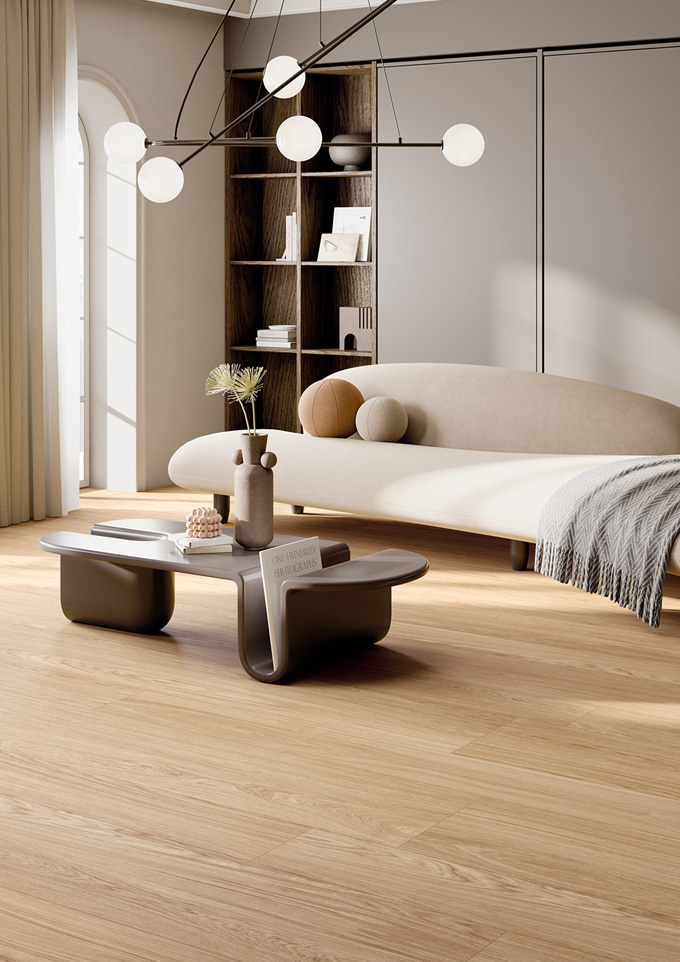 HONEY WOOD introduce il calore del legno con una tonalità miele uniforme, capace di rendere lo spazio accogliente senza chiuderlo. La posa dei listelli o dello chevron può contribuire nel rendere lo spazio otticamente più profondo.