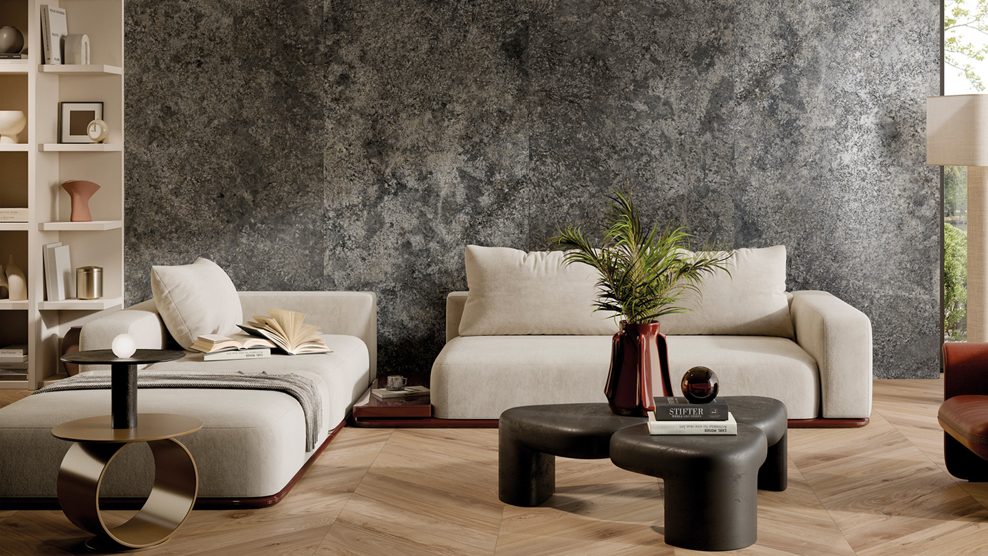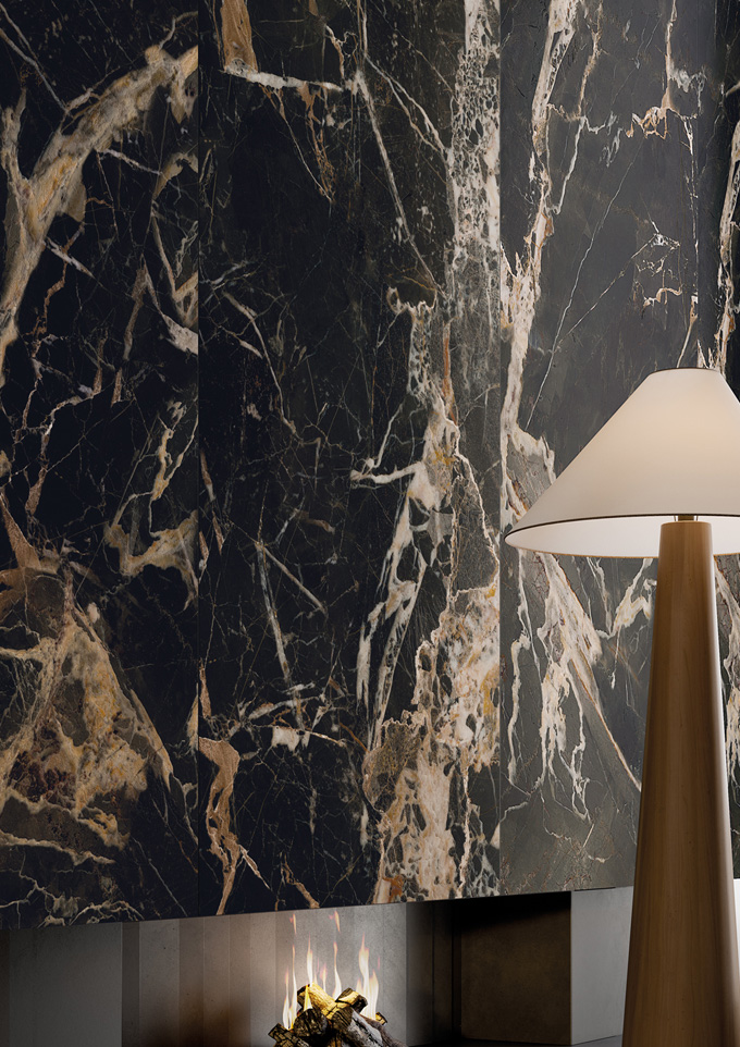 Tonalità chiare e luminose, come l’Avorio Segesta, attraversato da venature caldo-dorate, riflettono la luce, amplificando la percezione dello spazio e rendendo il soggiorno più arioso ed elegante. Accanto a queste, il Black Gold introduce una nota più intensa: superfici scure e segni grafici netti definiscono lo spazio con maggiore incisività, senza comprometterne l’equilibrio.