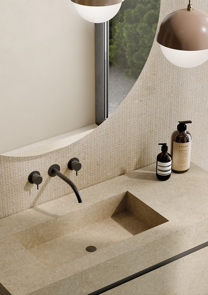 HOVER: Minimalistische Konsole aus Feinsteinzeug, ausgelegt für eine oder zwei Keramikschalen. Leichte Linien und strukturierte Oberflächen definieren eine essentielle Ästhetik, in der Feinsteinzeug die Hauptrolle übernimmt und mit Wand- und Bodenbelägen in einem stimmigen Gesamtkonzept dialogiert.