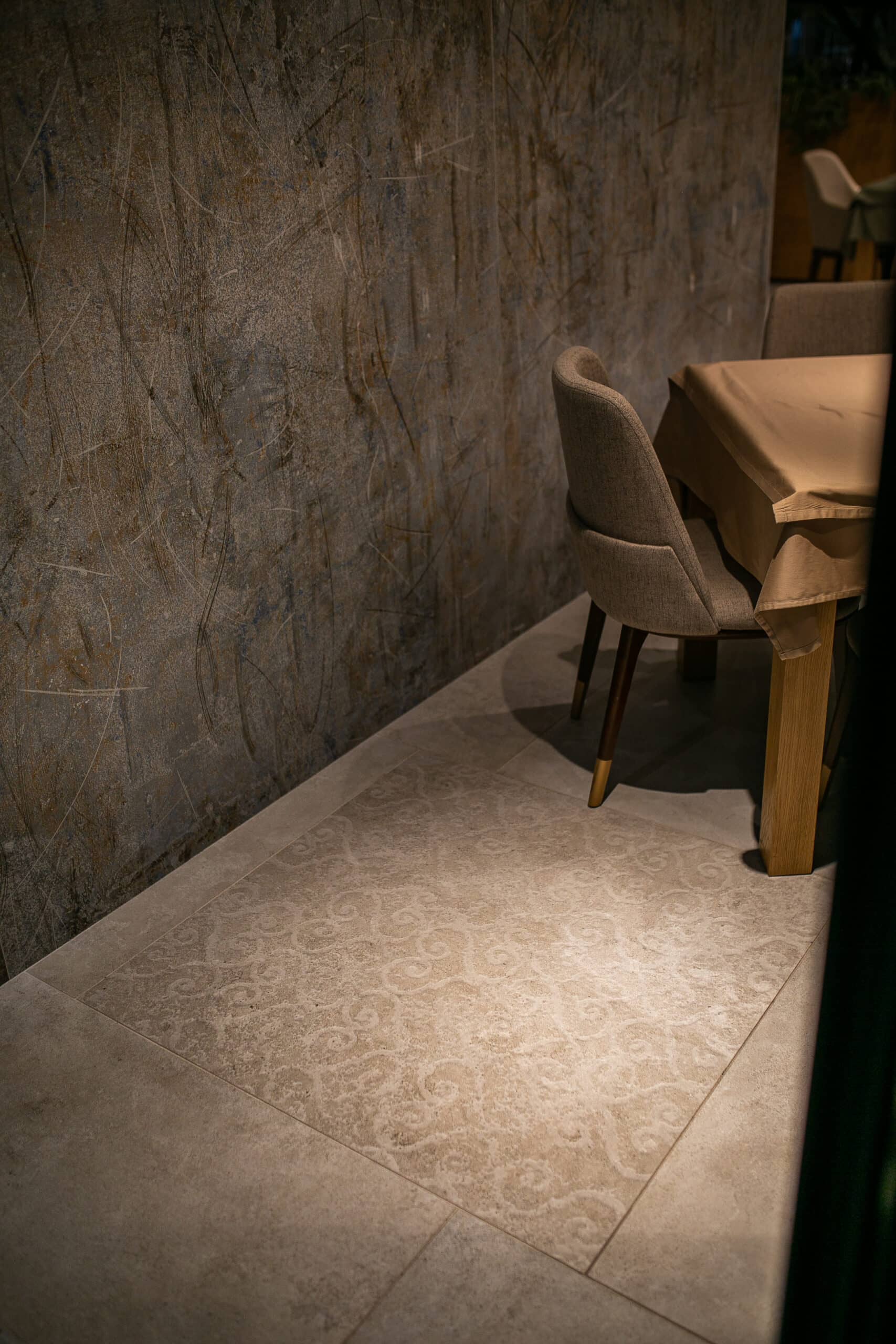 In the lounge area of the restaurant, the series SCRATCH has been chosen, designed for the AVA brand by architects Doriana and Massimiliano Fuksas. The colour Light Graffiti, with its large slabs, is a contemporary product with a metropolitan mood that lends personality to the space in an original way.