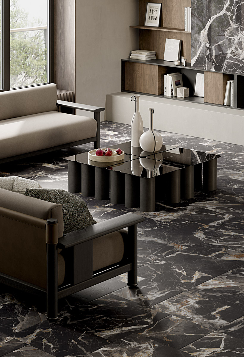 Présentée en avant-première au Cersaie 2025, Venezia célèbre la tradition artisanale italienne avec une interprétation contemporaine du marbre et du travertin. Sa ligne Modular, aux formats modulables et bords vieillis, exprime authenticité et élégance intemporelle.