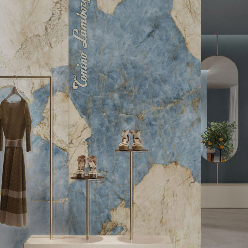 Una grande lastra effetto pietra dall’aspetto unico, con i suoi giochi di profondità e una gamma cromatica che, talvolta lontana dai modelli naturali, esprime delle versioni audaci ma dal valore estetico impareggiabile.